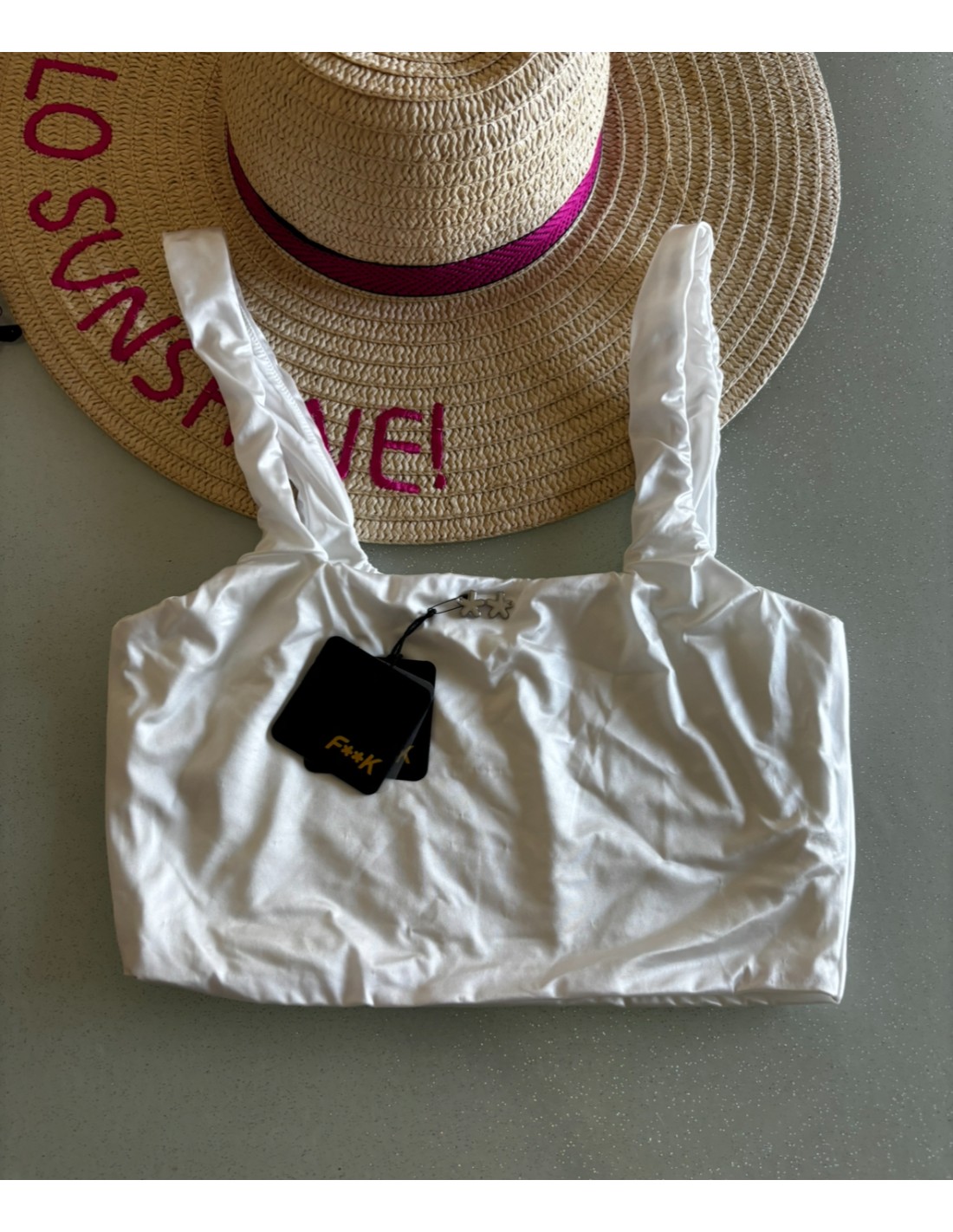 Top bianco F**K, con bretelle.