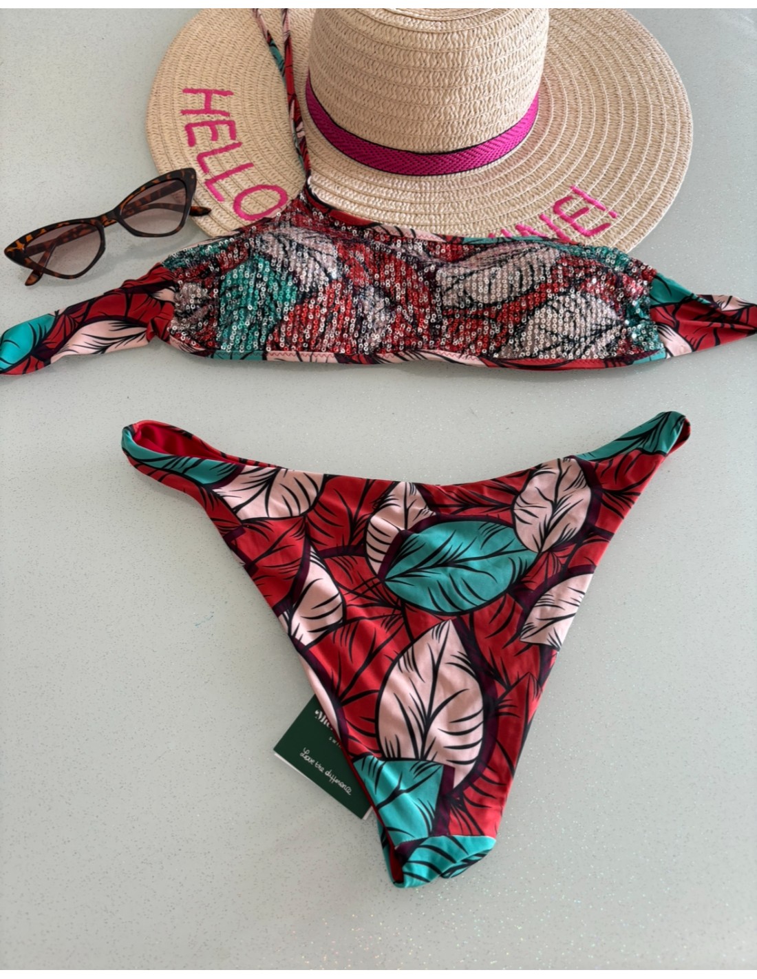Bikini a fascia Michiamofutura, mono spalla, con paillettes, coppe estraibili, slip fisso semplice.