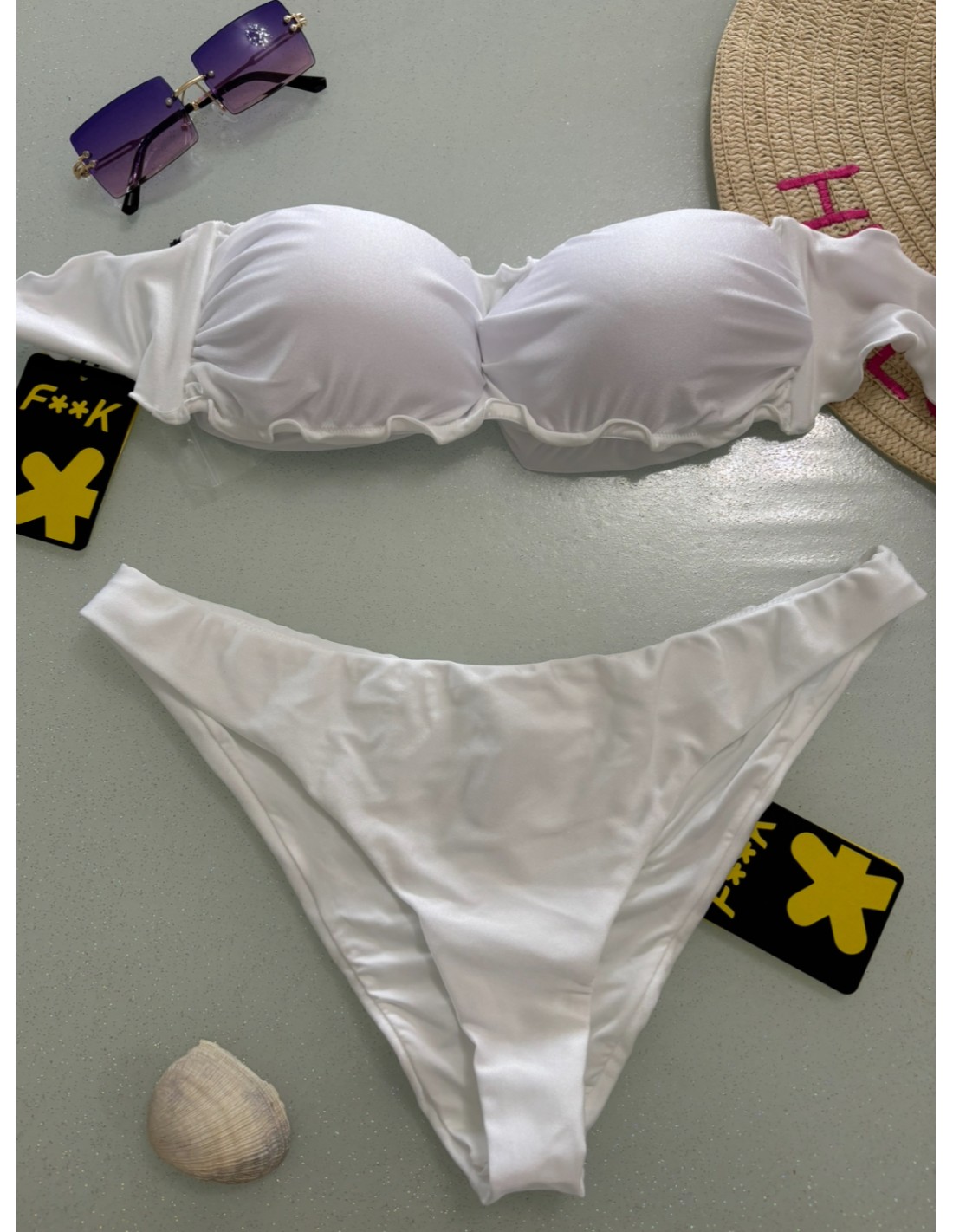Bikini bianco F**K, fascia coppe estraibili, slip fisso.