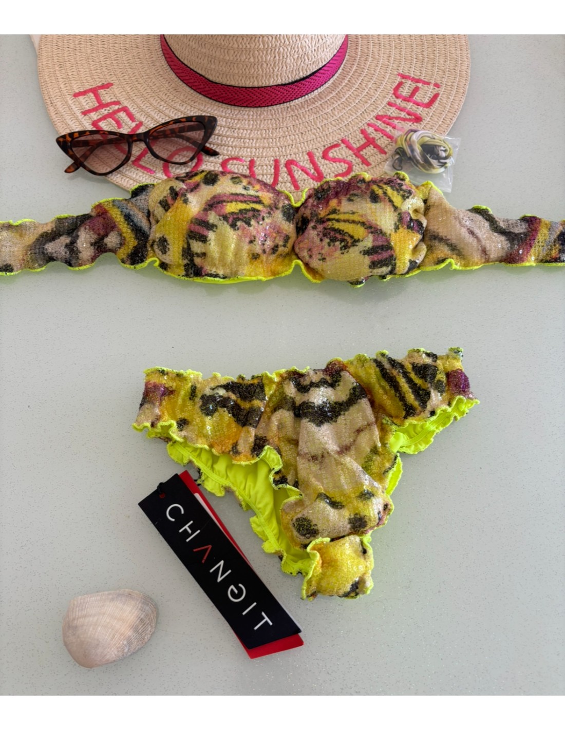 Bikini paillettes Changit, fascia coppe estraibili, slip fisso brasiliana.