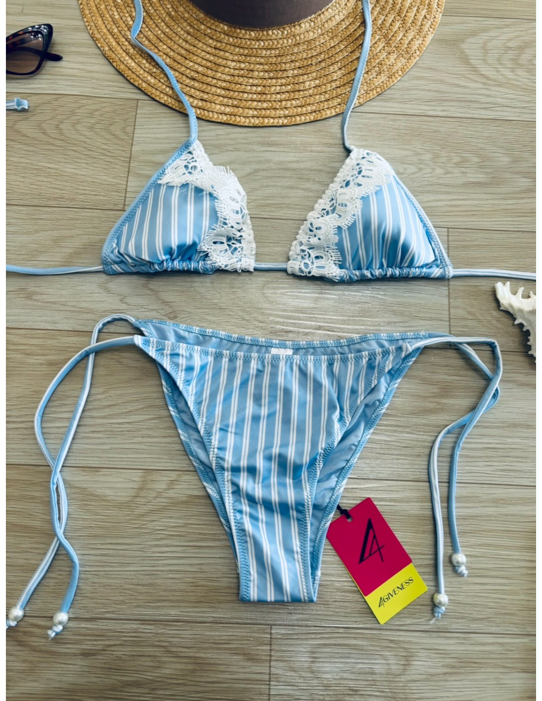 Bikini righe 4Giveness, triangolo coppe estraibili, slip con laccetti brasiliana.