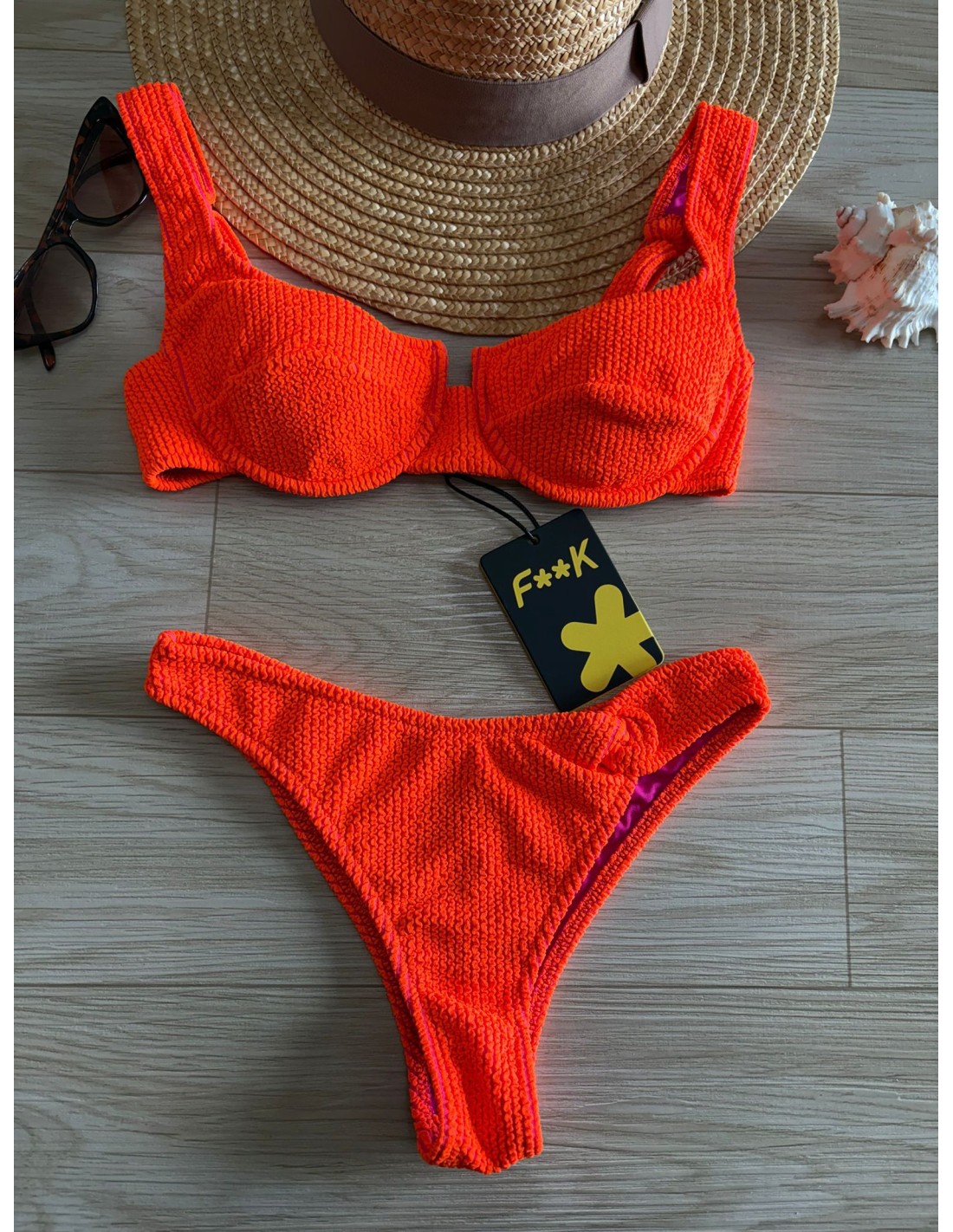 Bikini c/ferretto F**K, coppe estraibili, slip fisso brasiliana. reggiseno tg.S e slip tg.XS