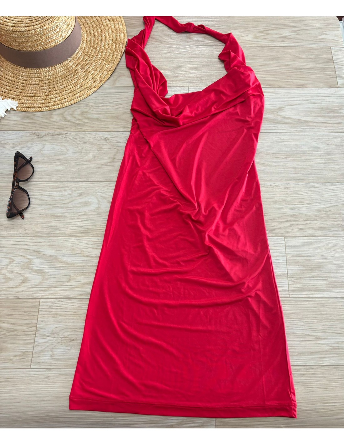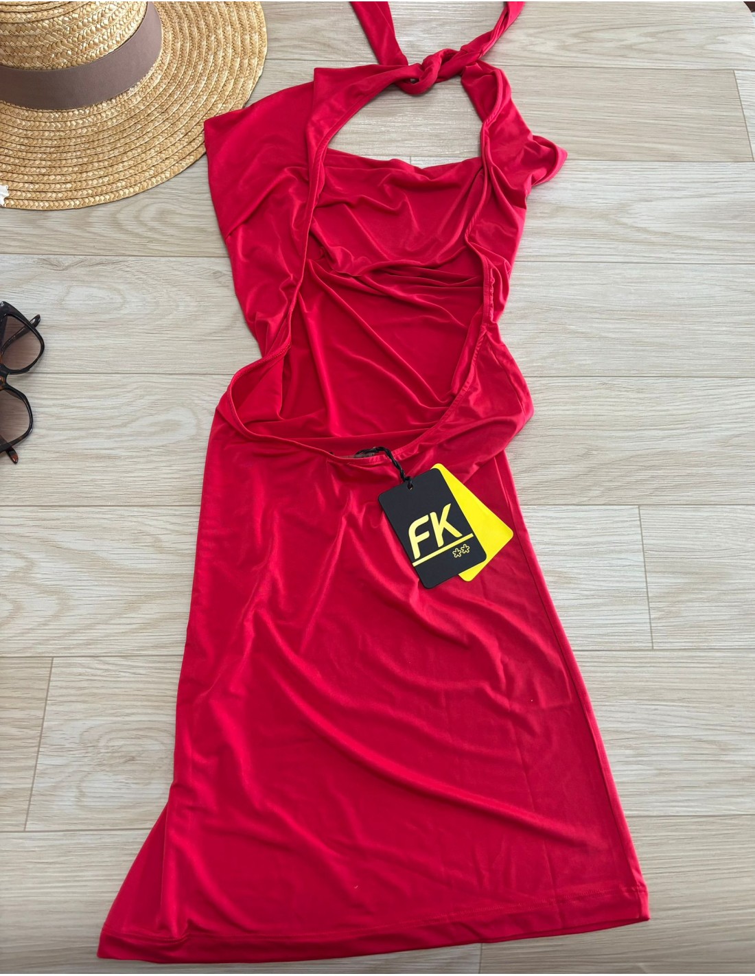 Abito corto rosso F**K, chiusura al collo, schiena scoperta.