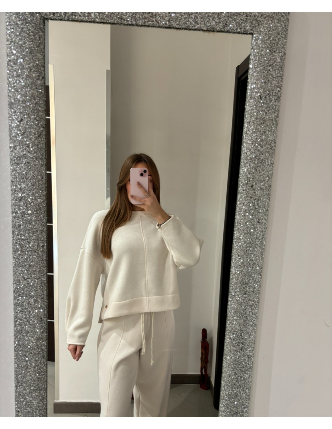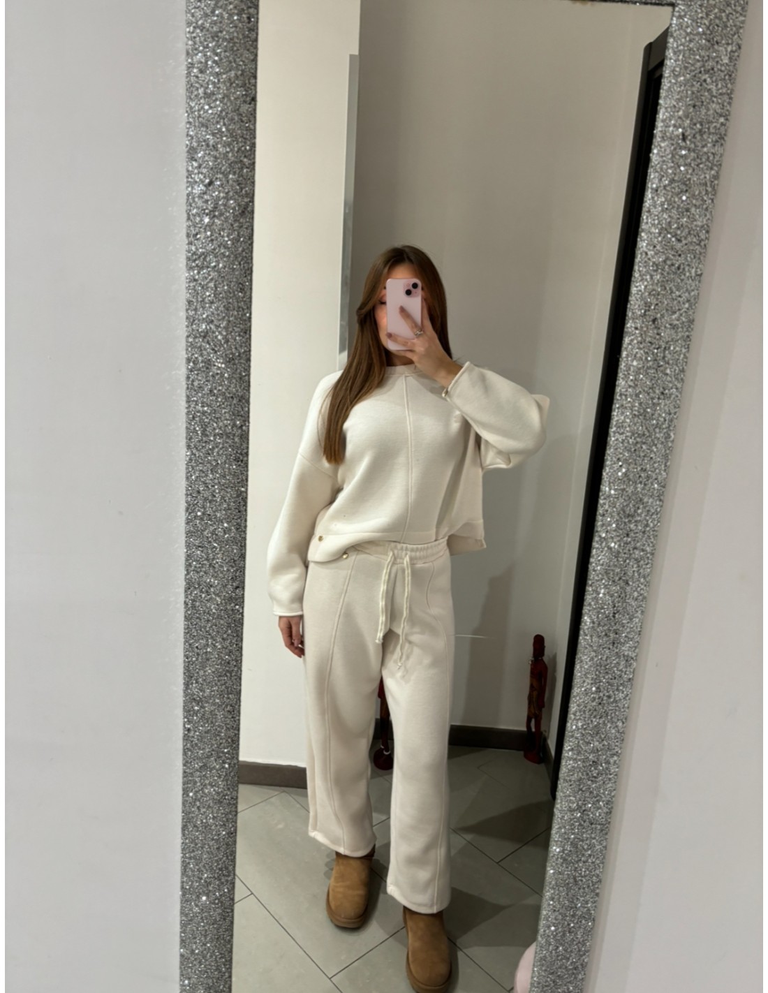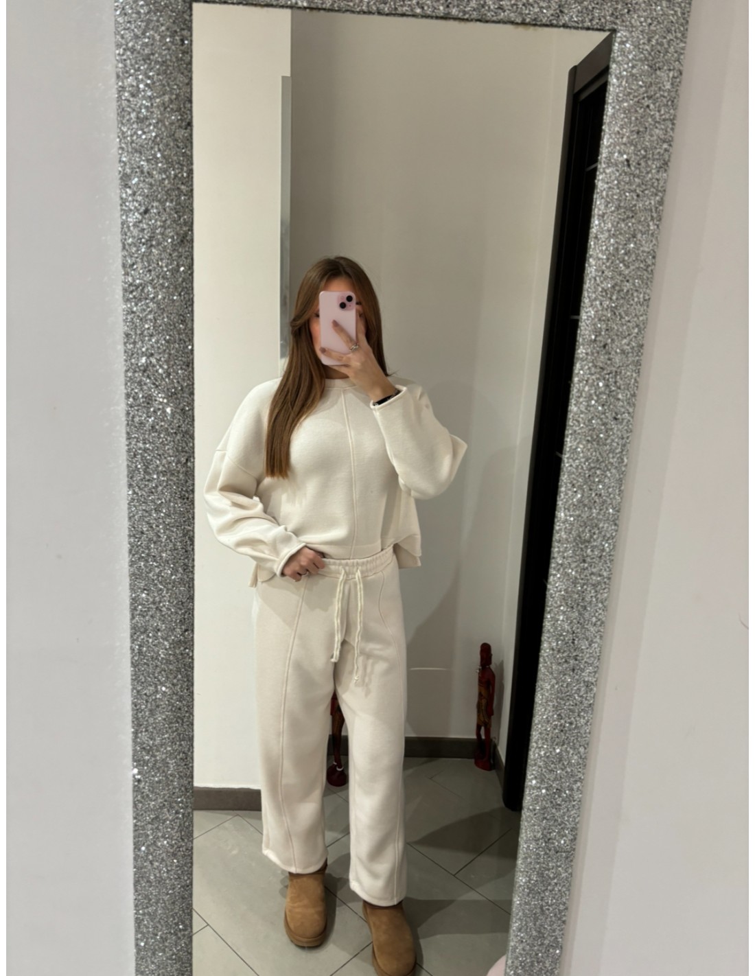 Completo di tuta beige Olivia Gray, felpa girocollo, manica con particolarità sul polsi, pantalone dritto con elastico e lacci, made in Italy.
