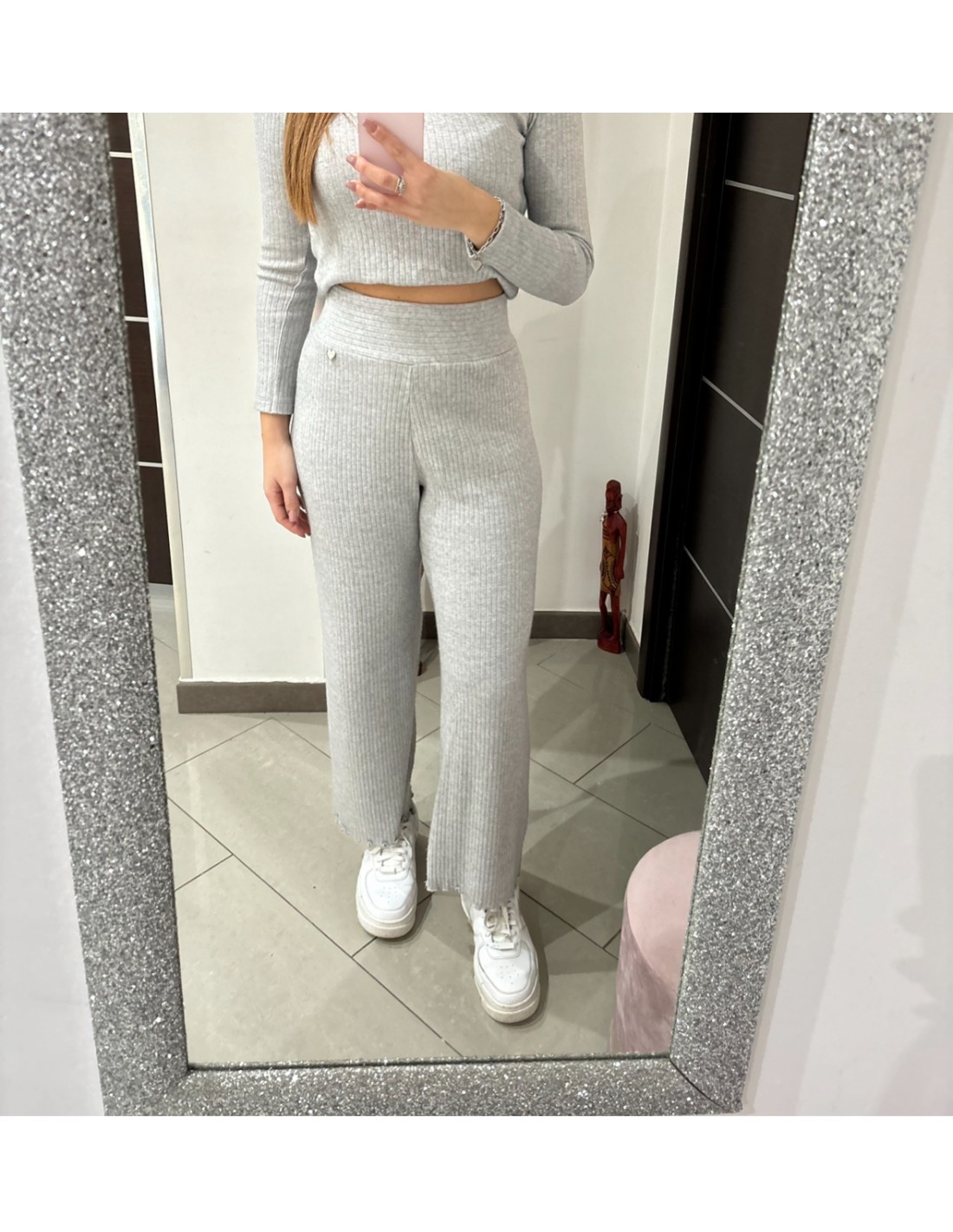 Coordinato grigio Olivia Grey, maglia girocollo, pantalone a palazzo.