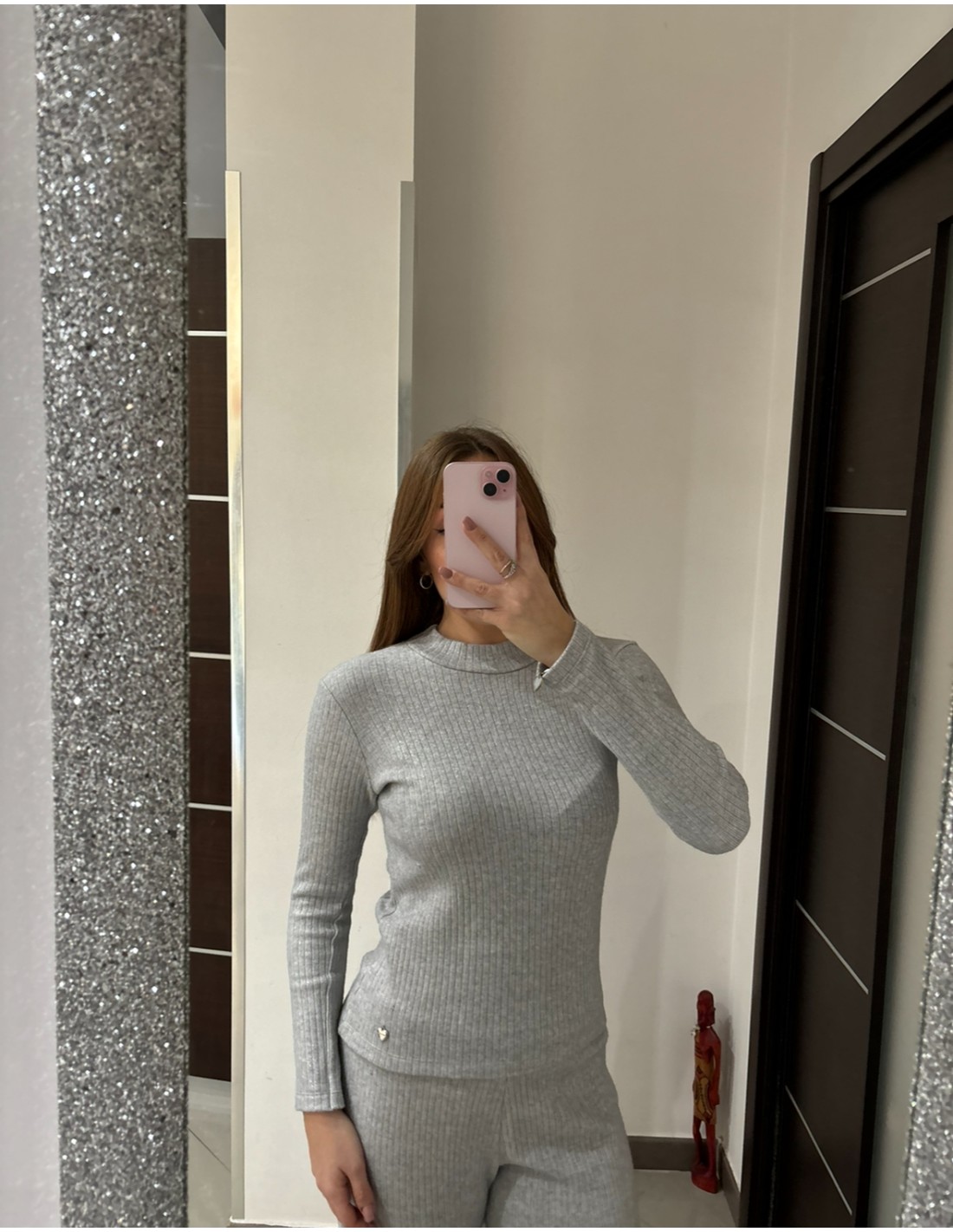 Coordinato grigio Olivia Grey, maglia girocollo manica lunga, pantalone a palazzo con fascione elastico. Made in Italy