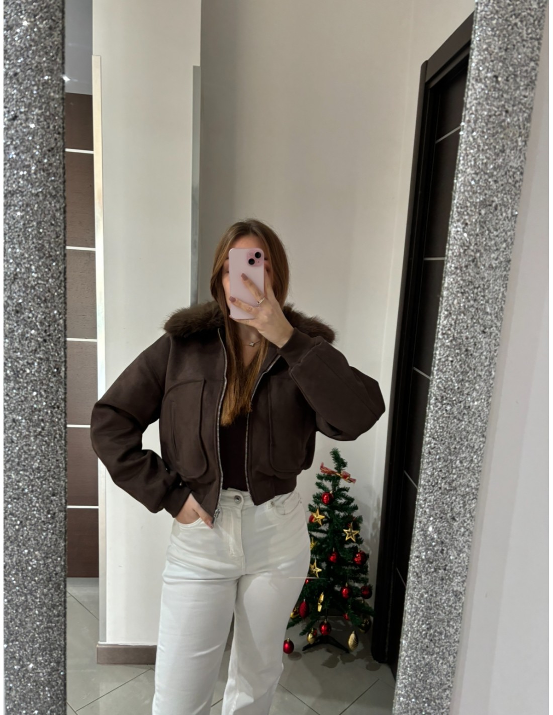 Bomber camoscio marrone con pelliccia, chiusura con zip.