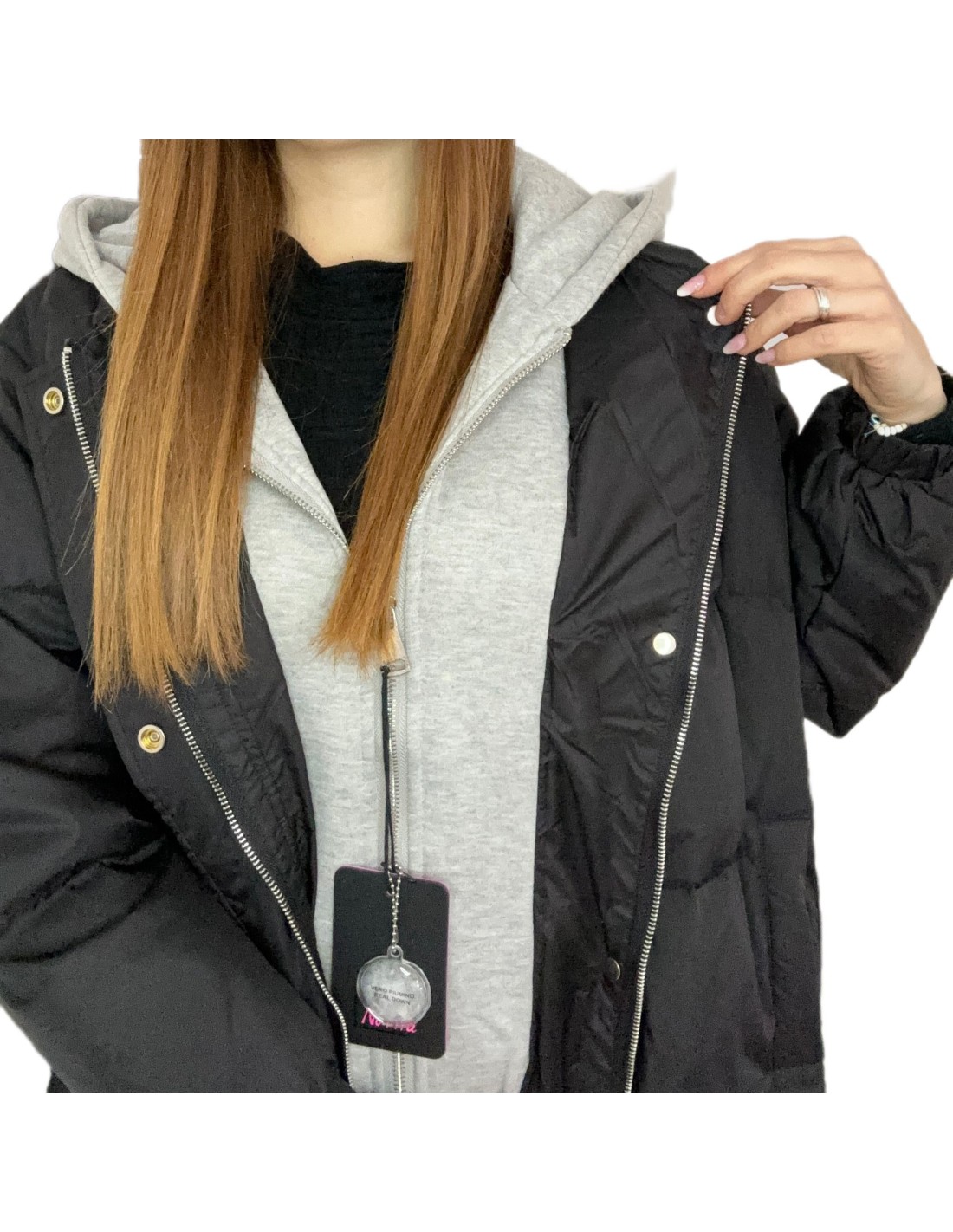 Piumino lungo felpa Nolita, chiusura con zip e bottoni, piuma d'oca, cappuccio, polsini. Veste regolare