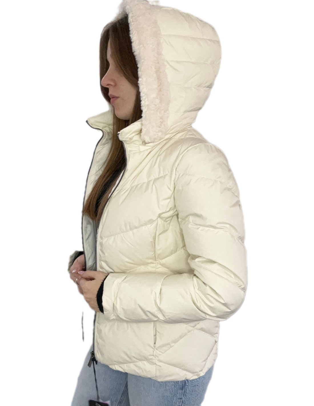 Piumino pelliccia Nolita, chiusura con zip e bottoni, piuma d'oca, tasche laterali con zip, cappuccio rimovibile.