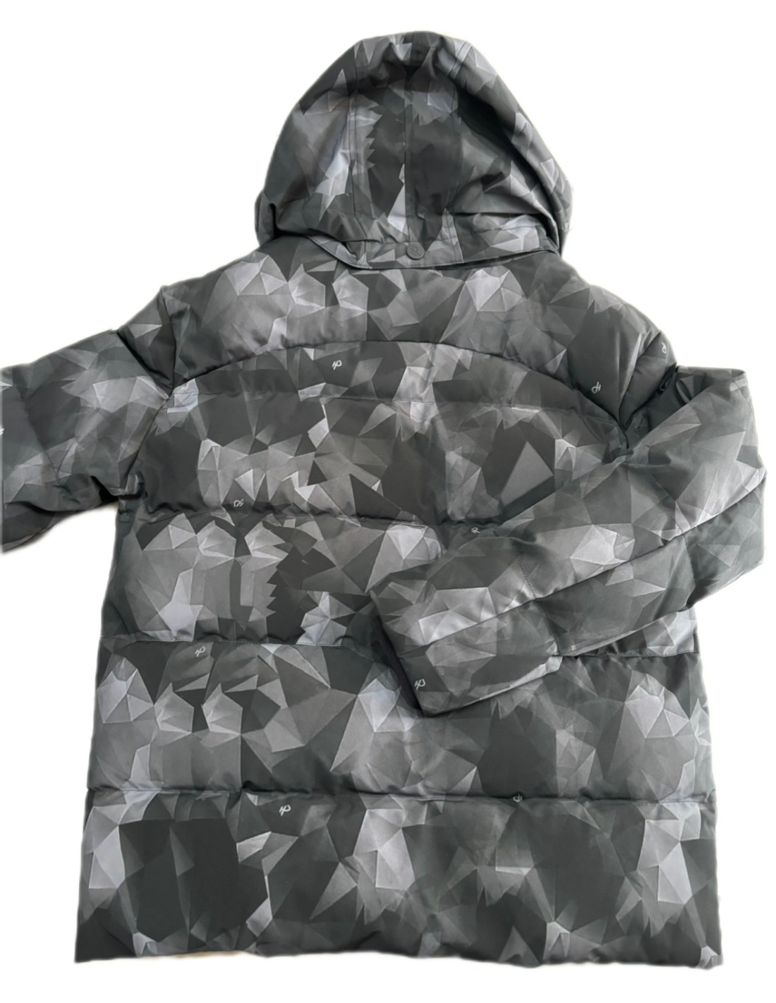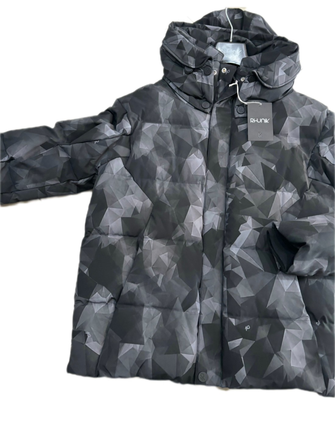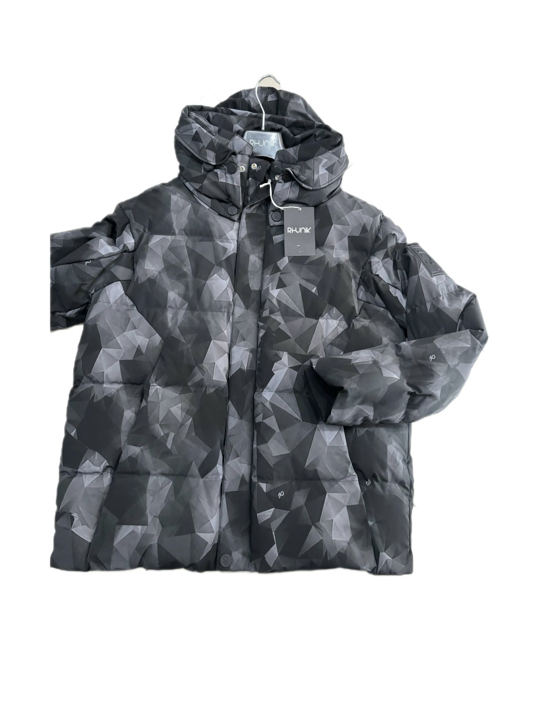 Piumino grigio uomo Rihunik, chiusura con zip e bottoni, cappuccio rimovibile, polsini, tasche laterali.