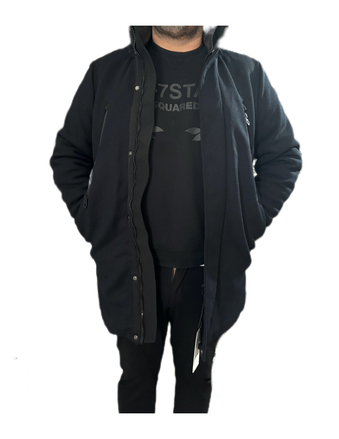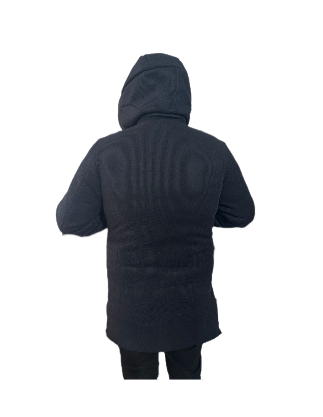 Cappottino Rihunik blu, chiusura con zip e bottoni, quattro tasche laterali, cappuccio removibile, polsini.