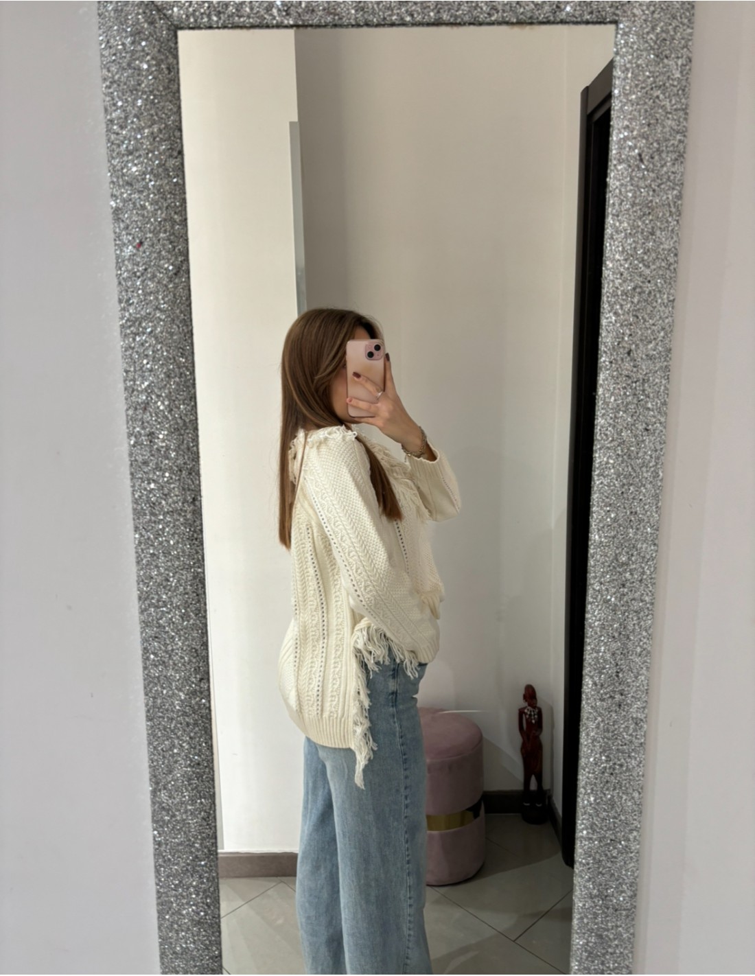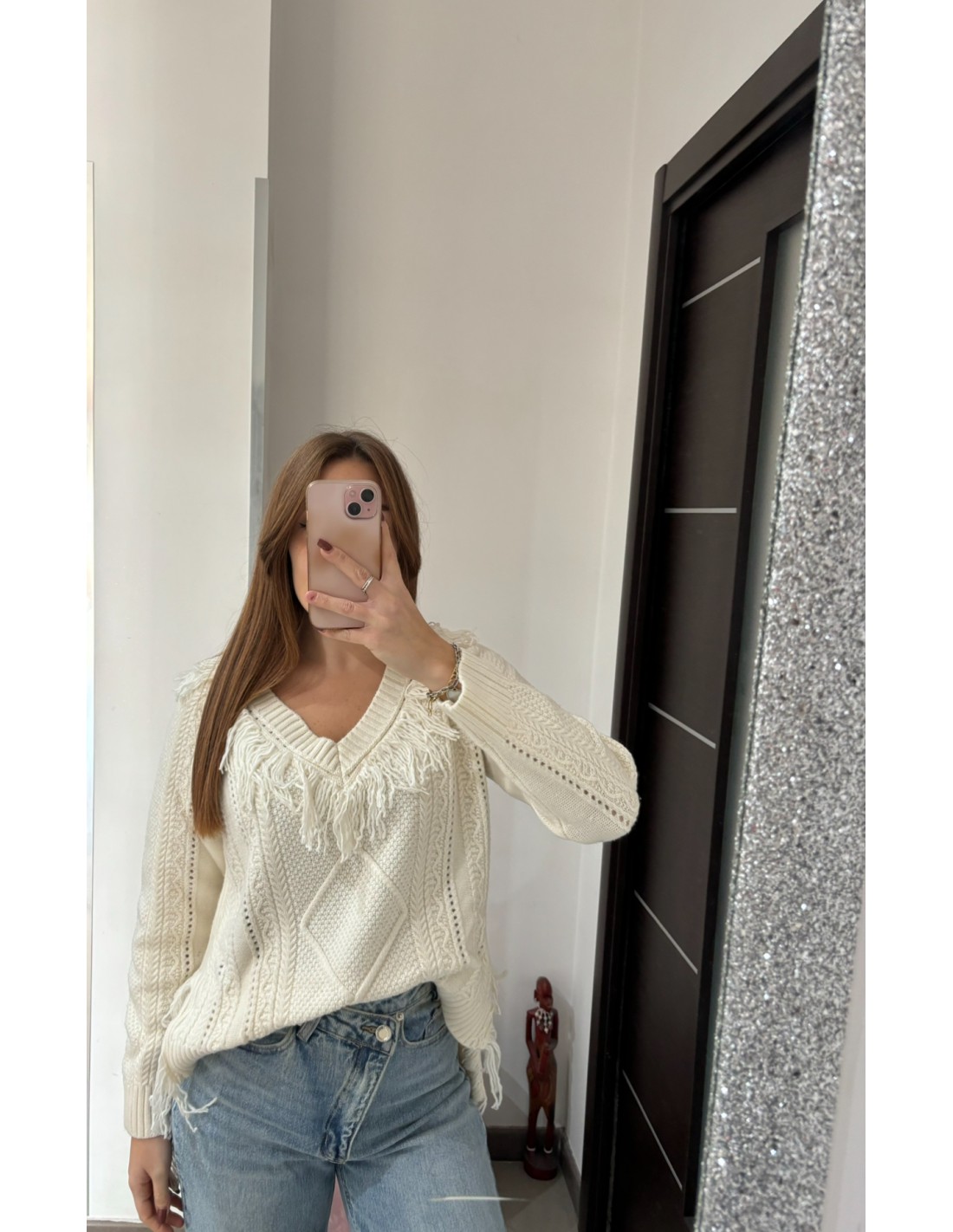 Maxi maglia, tinta unita, scollo a v con frange, 100% lana, spacchi laterali con frange, polsini,manica lunga.