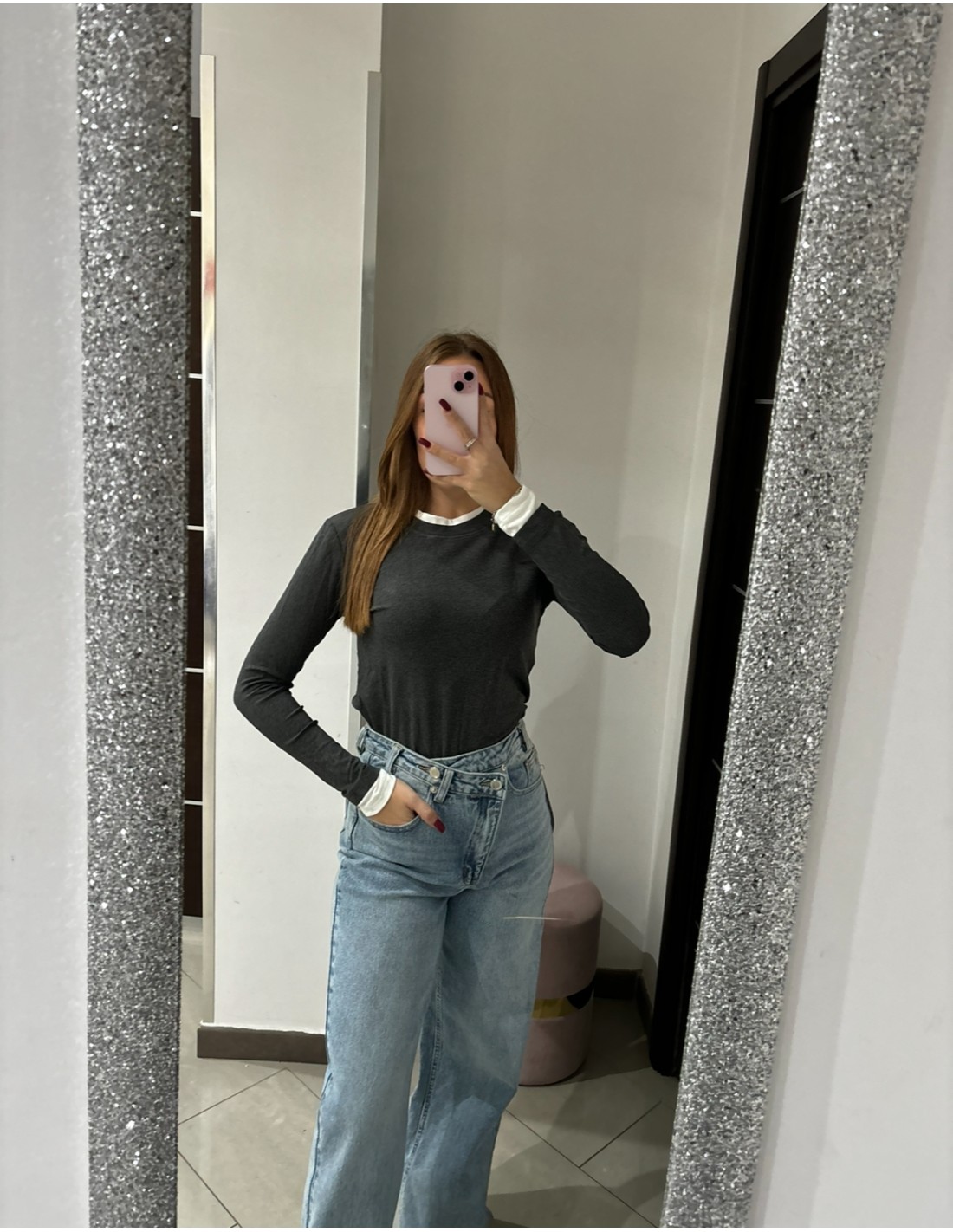 Maglia manica lunga bicolor, girocollo, bordi a contrasto al collo ai polsini e sul fondo.