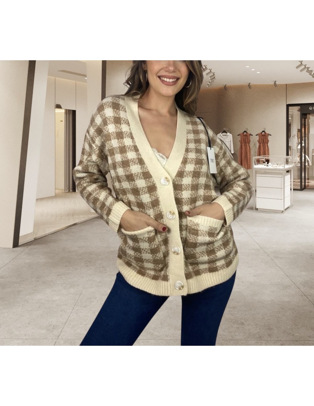 Cardigan donna Gretha Milano, manica lunga, a quadri, con bottoni.