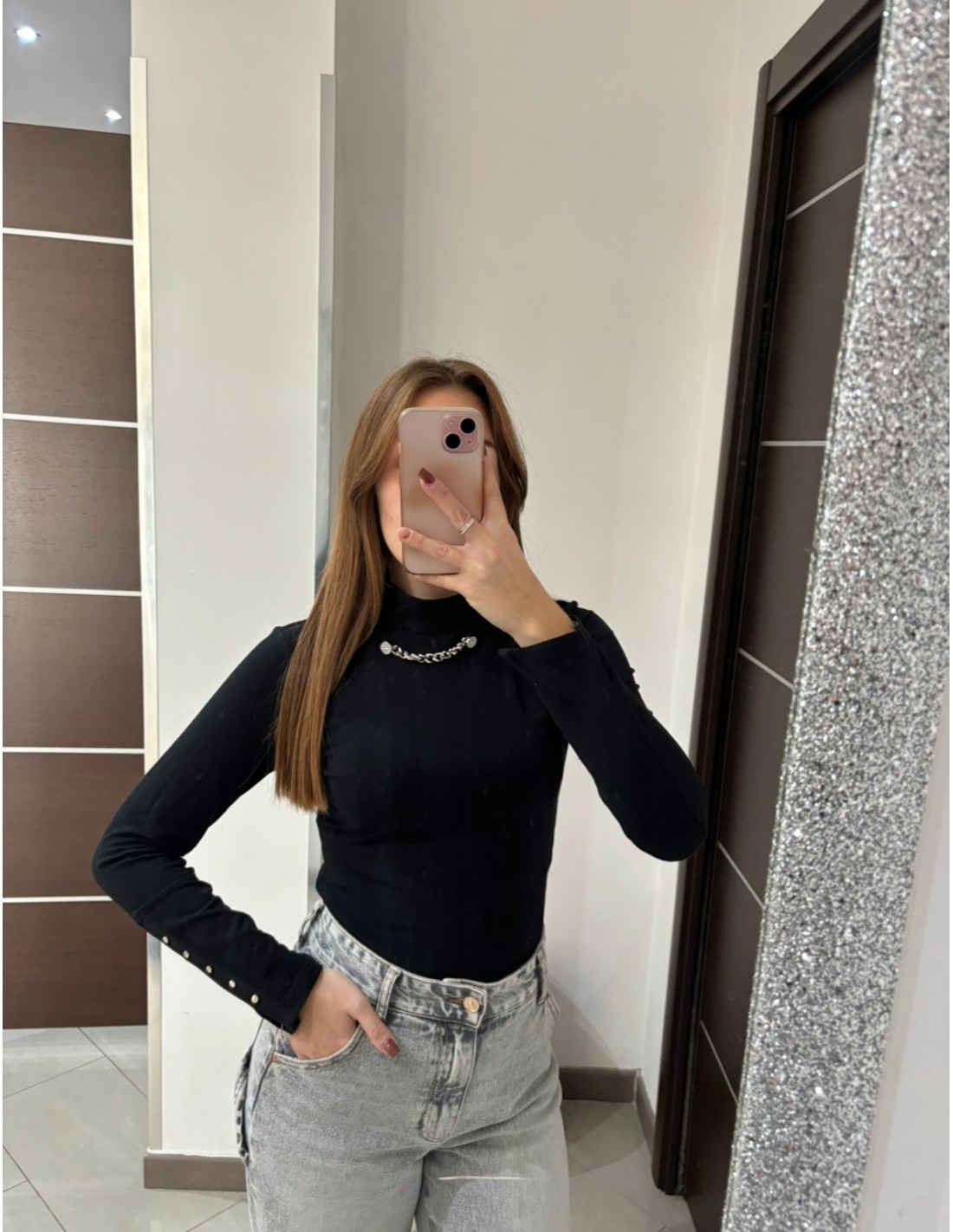 Lupetto nera Camomilla, manica lunga, lunghezza basic, con bottoni vicino il polso.