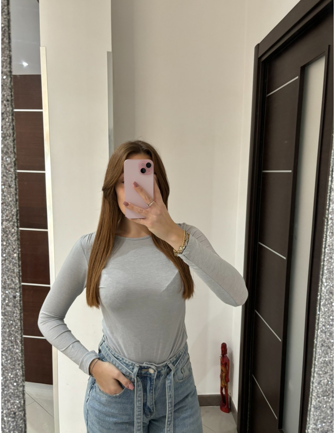 Maglia grey Olivia, manica lunga, arricciata sulla spalla, made in Italy.