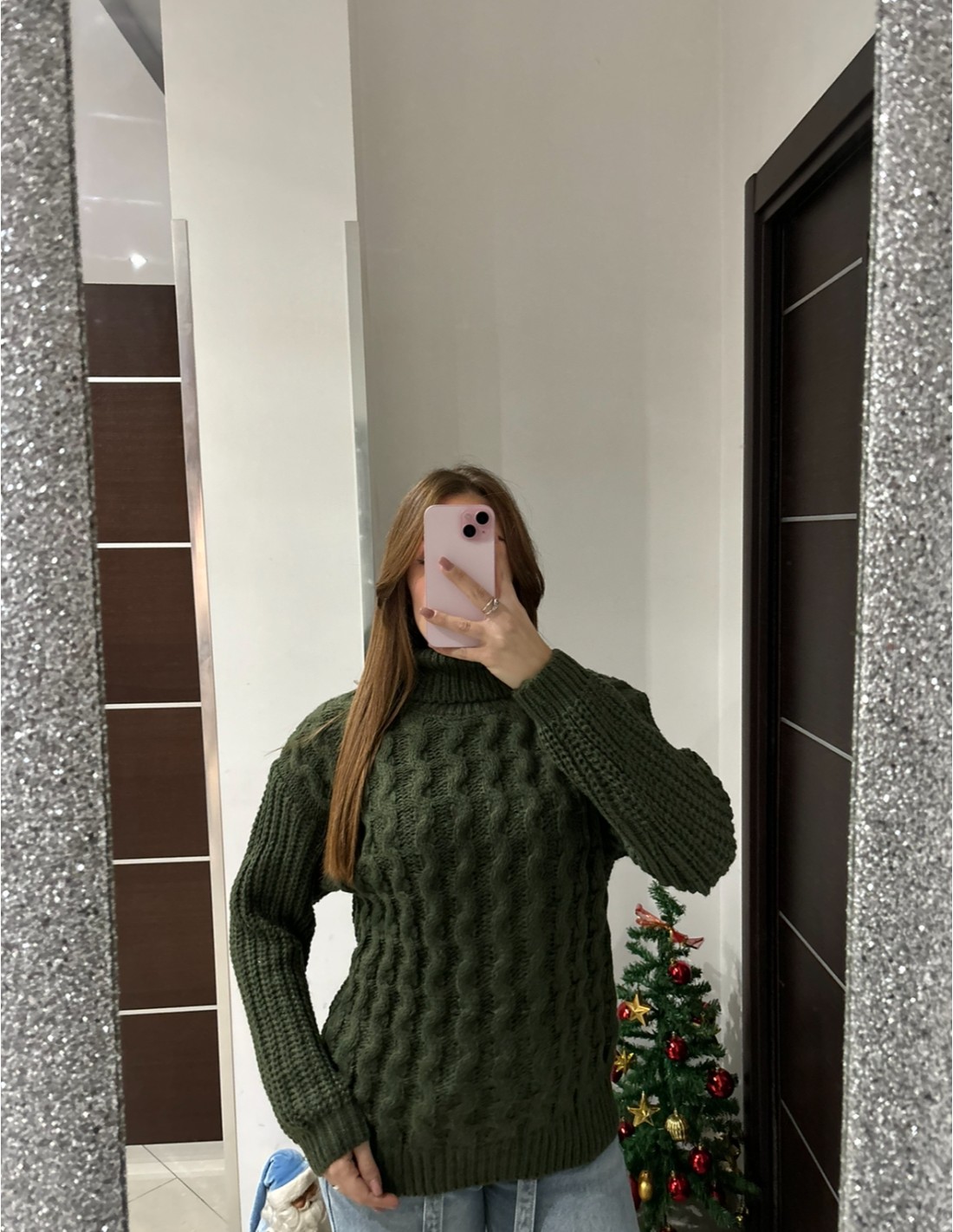Maglione lungo onde, collo alto, manica lunga, con polsini.