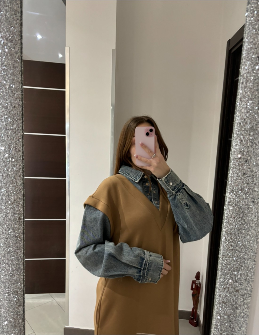 Abito corto in tessuto scuda e jeans Twinset, con colletto e scollatura a V, manica lunga con polsini e bottoncini, placchetta logo in metallo sul retro.